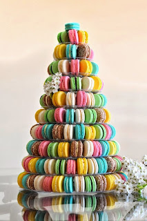 Turn de prajituri macarons - asemanator cu turnul din briose. Delicioase si aromate, aceste mici prajiturele pot veni in orice culoare si cu diverse arome: ciocolata, fistic, cafea, cocos, scortisoara, trandafir, zmeura, vanilie sau visine.